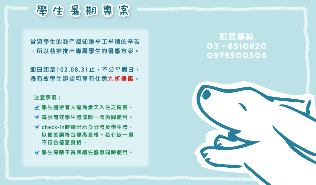 2013 學生暑期專案 當過學生的我們都知道半工半讀有多辛苦,一邊顧課業另一邊賺錢養自己,所以,花蓮民宿巷宿特別推出專屬學生的優惠方案! 注意事項 學生證持有人需為當天入住之房客。 每張有效學生證僅限一間房間使用。 check-in 時請出示身分證及學生證,以便確認符合優惠資格。若有缺一則不符合優惠資格。 學生專案不得與續住優惠同時使用。 巷宿2013-09-25T22:24:38+08:00Tags: 優惠, 學生專案|