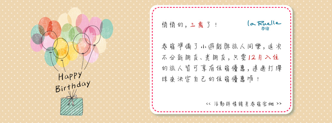 悄悄的,三歲了!巷宿準備了小遊戲與旅人同樂,這次不分新朋友、舊朋友,只要是12月入住的旅人皆可享有住宿優惠,最高可享七折優惠喔,快來透過打彈珠來決定自己的住宿優惠吧!