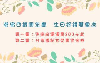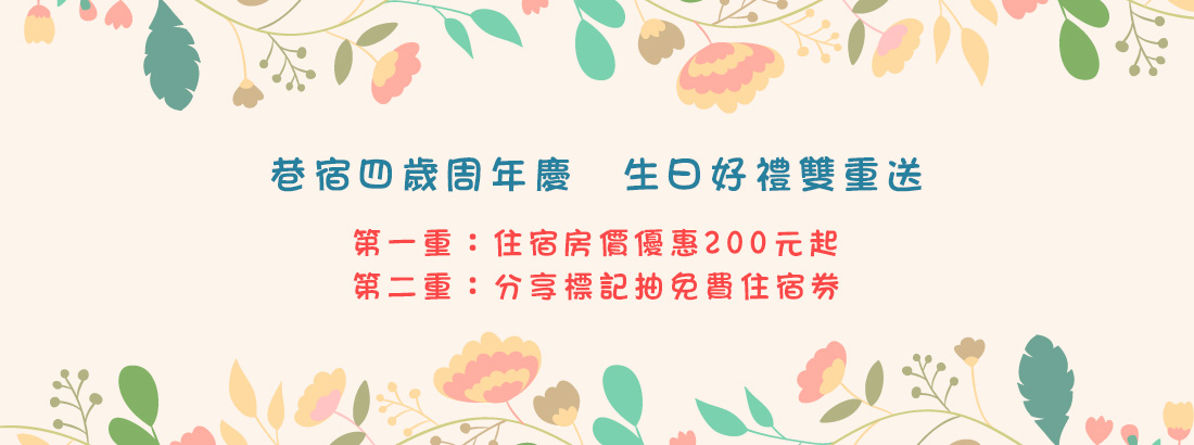 時光飛逝,轉眼間巷宿就四歲了,今年很多旅人回來找我們玩,真心覺得高興。今年的生日禮,就用最實際的折價優惠來回饋各位旅人!好康限時送,活動期間入住,不分平假日通通有優惠 !